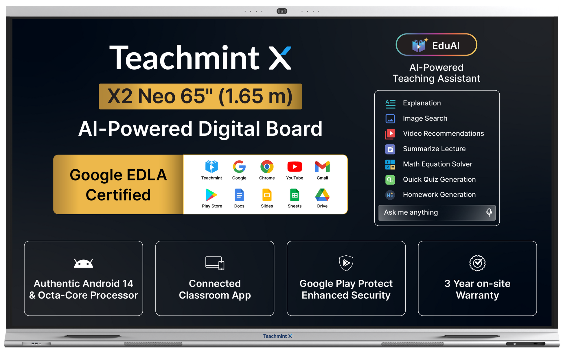 Transform teaching with our Google EDLA Certified AI-Powered Digital Board for Teaching, featuring Android 14, a 2X faster Octa-Core Processor, and the most powerful NPU for AI tasks. Teach seamlessly with an AI teaching assistant, the Connected Classroom App, & an All-in-One Whiteboard. Access your favourite Play Store apps with enhanced performance & security.